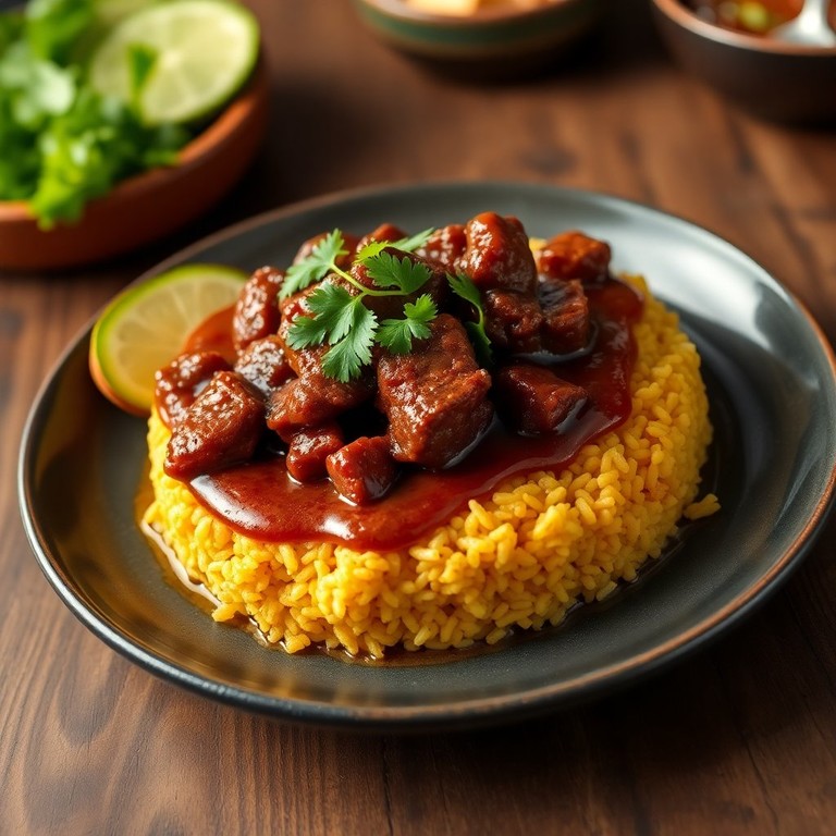 Un delicioso plato peruano que combina arroz y frijoles con un jugoso lomo de res, ideal para disfrutar en una comida especial.