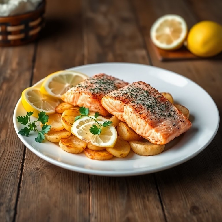 Una combinación perfecta de salmón jugoso y papas doradas al horno, ideal para una cena especial o un almuerzo nutritivo. Este plato es fácil de preparar y lleno de sabor, gracias a la mezcla de especias y la frescura del limón.