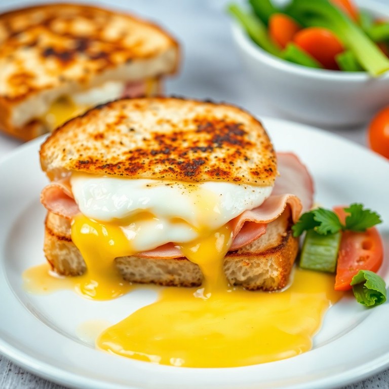 Un sándwich caliente y cremoso que mezcla huevo, jamón y queso en pan tostado, perfecto para un desayuno o un almuerzo rápido.