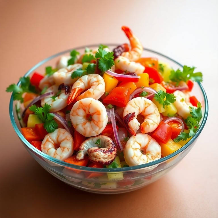 Una deliciosa mezcla de camarones, pulpo y carrucho con un toque cítrico, esta ensalada de mariscos frescos es perfecta para un día caluroso. Los sabores cítricos del limón y la naranja realzan la frescura de los mariscos, mientras que los pimientos y el cilantro añaden un toque de color y frescura.