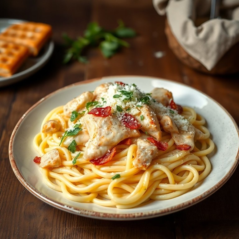 Pasta Alfredo con Pollo y Tocineta