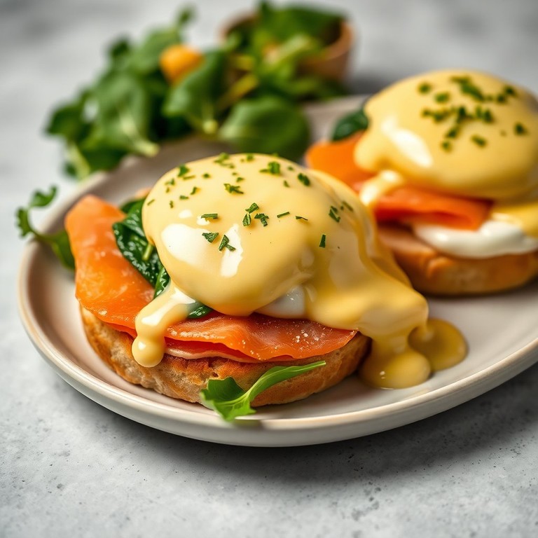 Deliciosos huevos benedictos acompañados de salmón ahumado y espinacas frescas, perfectos para un brunch especial.