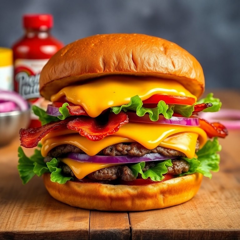 Una jugosa hamburguesa con dos capas de bacon crujiente y queso fundido.