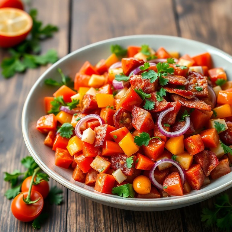 Uma salada refrescante e saborosa, perfeita para acompanhar qualquer refeição, com tomates frescos, bacon crocante e calabresa.