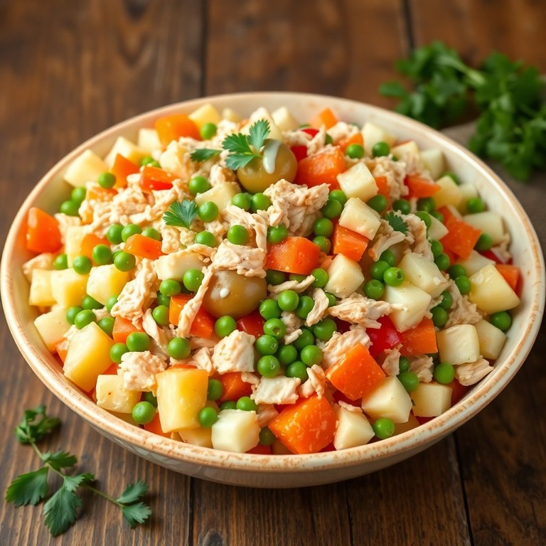 Una deliciosa mezcla de verduras y pollo, perfecta para cualquier ocasión. Esta ensalada es una variante de la clásica ensalada rusa, ideal para quienes prefieren el pollo en lugar del atún.