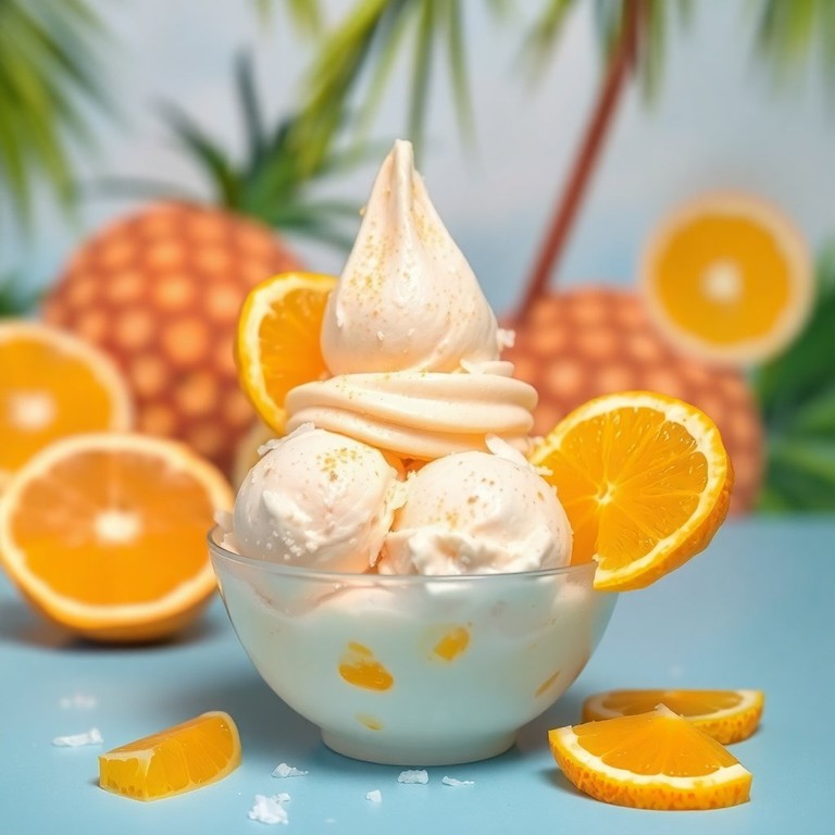 Un helado refrescante y tropical que combina el sabor cítrico de la naranja con la dulzura del coco y la piña. Perfecto para un día caluroso, este helado es una delicia cremosa que transporta tus sentidos a una isla paradisíaca.