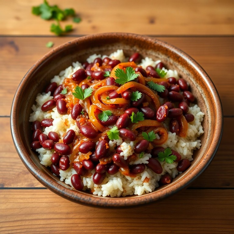 Un plato reconfortante que combina la suavidad del arroz con el sabor intenso de los frijoles rojos y la dulzura de la cebolla caramelizada.