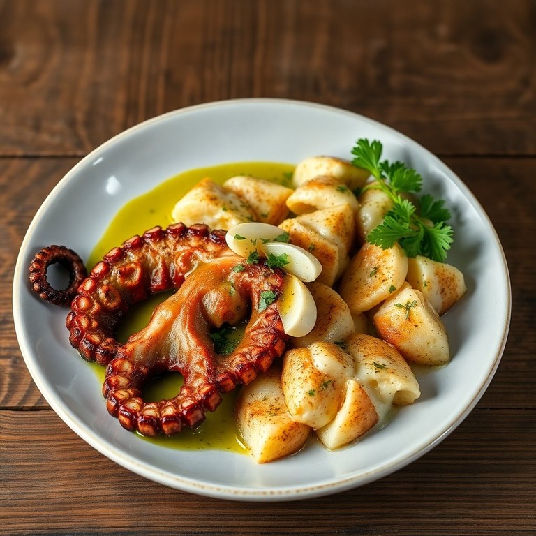 Uma combinação perfeita de polvo grelhado e batatas rústicas, regadas com azeite e alho. Este prato é uma verdadeira iguaria da culinária portuguesa, trazendo sabores intensos e uma apresentação encantadora.