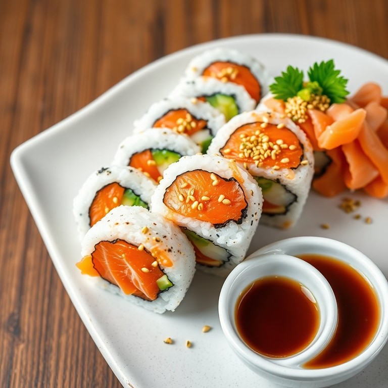 Este sushi de salmón picante es una deliciosa combinación de sabores frescos y picantes, ideal para los amantes del sushi que buscan una experiencia audaz. La salsa de sésamo añade un toque especial que complementa perfectamente el salmón y los vegetales.
