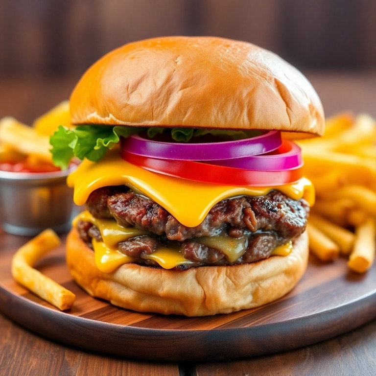 Un hamburger traditionnel préparé avec de la viande de qualité, accompagné de frites croustillantes, parfait pour un repas réconfortant.
