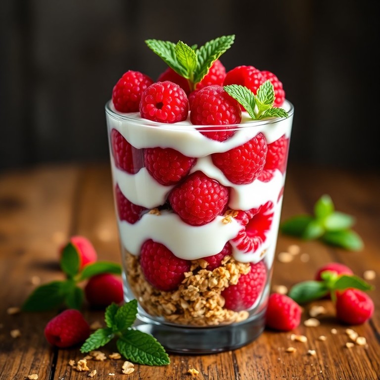 Este parfait de frambuesas y yogur griego es una deliciosa combinación de frescura y cremosidad, ideal para un desayuno saludable o un postre ligero. Las capas de frambuesas jugosas, yogur cremoso y granola crujiente crean una experiencia de sabor y textura inigualable.