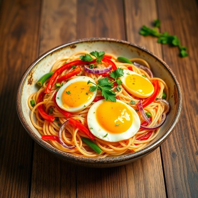 Un plato rápido y nutritivo: spaghetti salteados con huevo, morrones y cebolla morada, perfecto para cualquier comida del día.