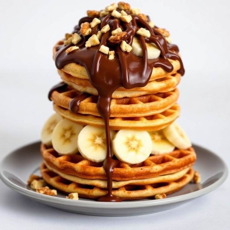 Disfruta de una torre irresistible de panclaes y waffles, bañados en crema de chocolate y nueces.