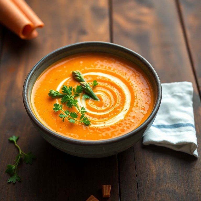 Una sopa vibrante que mezcla la dulzura de la zanahoria con la textura del mote y un suave sabor a espárragos.
