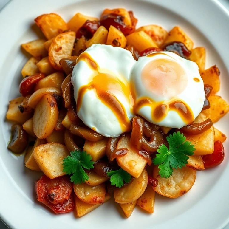 Un plato clásico español que combina la suavidad de los huevos rotos con el dulzor de la cebolla caramelizada y el sabor del fuet, todo sobre una base crujiente de patatas fritas.