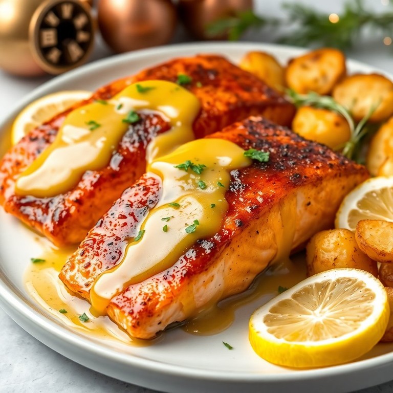 Un salmón jugoso y sabroso, ideal para celebrar la Navidad, acompañado de papas doradas que complementan perfectamente el plato.