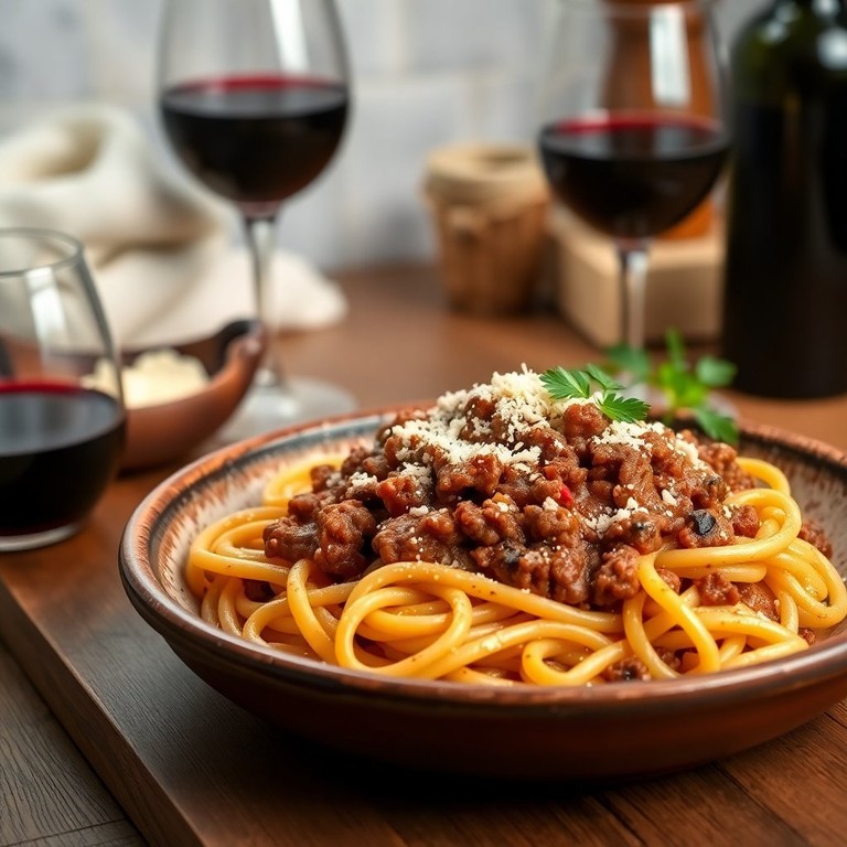 Disfruta de una deliciosa fusión de sabores con tallarines en una salsa de vino tinto, carne molida y cebolla, ideal para una cena especial.