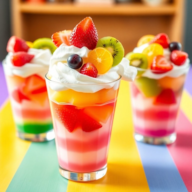 Un postre colorido y divertido, perfecto para sorprender a tus invitados. Esta copa de gelatina de frutas es fácil de hacer y no requiere horno, ideal para cualquier ocasión.