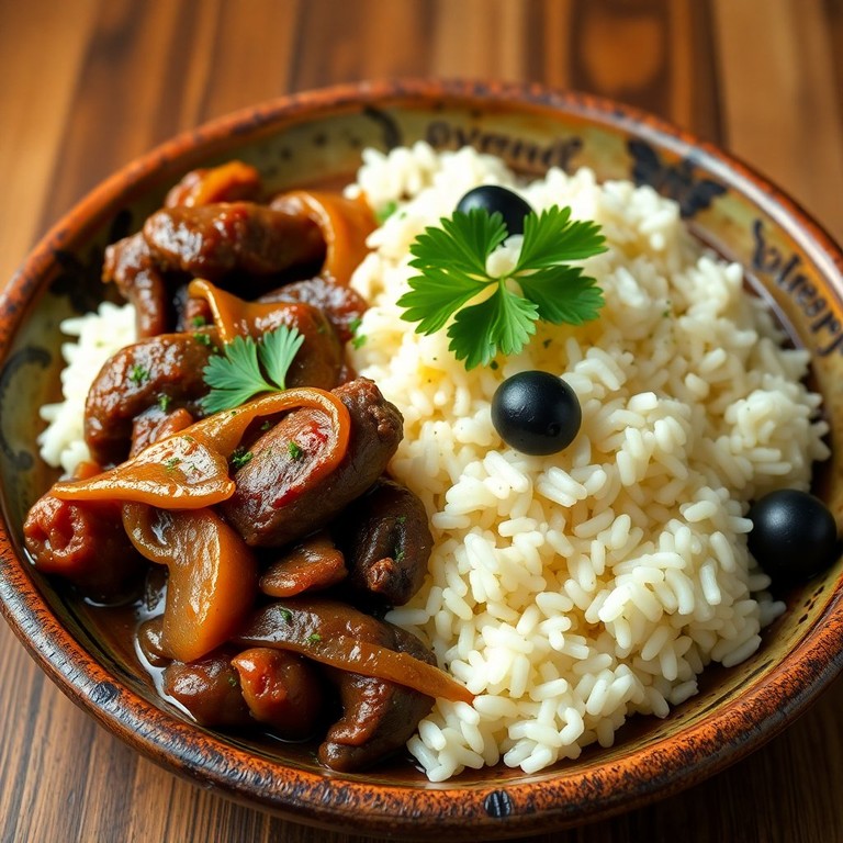 Um prato reconfortante que une carne acebolada e arroz, com um toque especial de azeitonas.