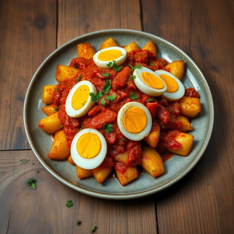 Crujientes patatas bravas acompañadas de una suave salsa de huevo y chorizo, ideal como aperitivo.