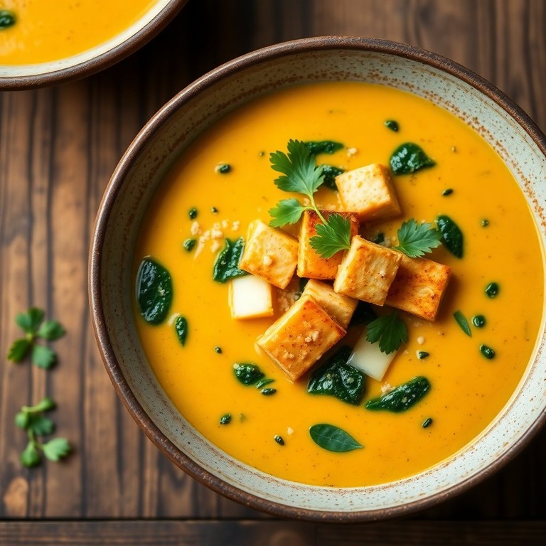 Crema de Calabaza y Espinacas con Topping de Tofu y Queso Vegano
