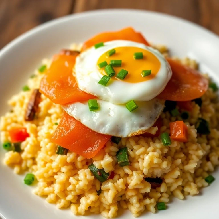 Este plato reconfortante combina la suavidad del arroz con el toque ahumado del salmón, complementado con huevos estrellados que aportan cremosidad y sabor. Ideal para una comida nutritiva y deliciosa.