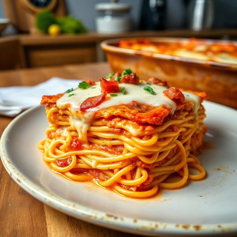 Reinventando la lasaña, este plato mezcla espaguetis, bacon y una generosa capa de queso.