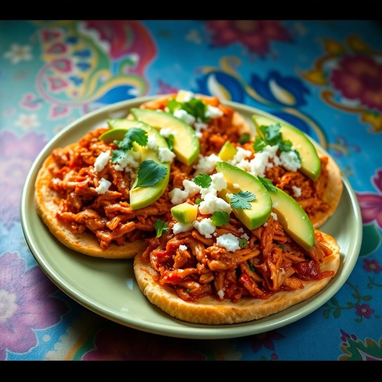 Deliciosas tostadas crujientes cubiertas con pollo desmenuzado y una exquisita salsa de pepián, perfectas para cualquier ocasión.