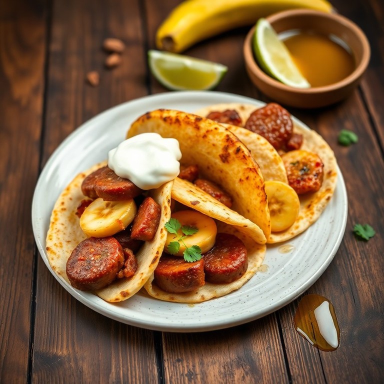 Deliciosas tortillas rellenas de plátano y salchicha, perfectas para un desayuno nutritivo.