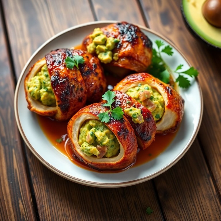 Una deliciosa combinación de sabores en un jugoso pollo asado, relleno de aguacate cremoso y jamón serrano crujiente, perfecto para una cena especial.
