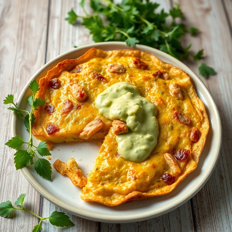 Una deliciosa tortilla española, enriquecida con pollo y acompañada de una suave salsa de aguacate.