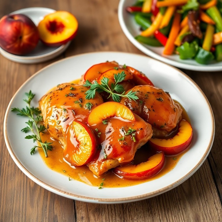 Deliciosos muslos de pollo marinados y bañados en una salsa dulce de durazno, perfectos para una cena especial.