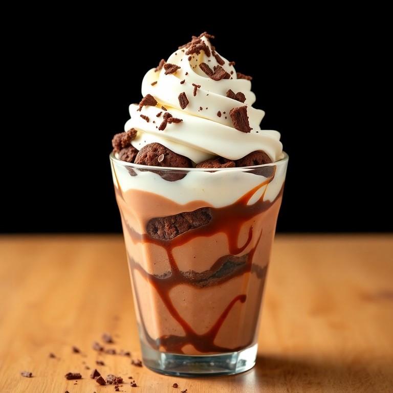 Un postre decadente que combina helado de chocolate cremoso con galletas crujientes y un toque de licor de chocolate, perfecto para los amantes del chocolate.