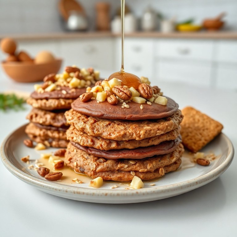 Deliciosos panqueques de avena y cacao, perfectos para un brunch saludable. Esta versión utiliza avena en lugar de harina, manteniendo la suavidad y el sabor, y se complementa con una mezcla de frutos secos y un toque de miel.