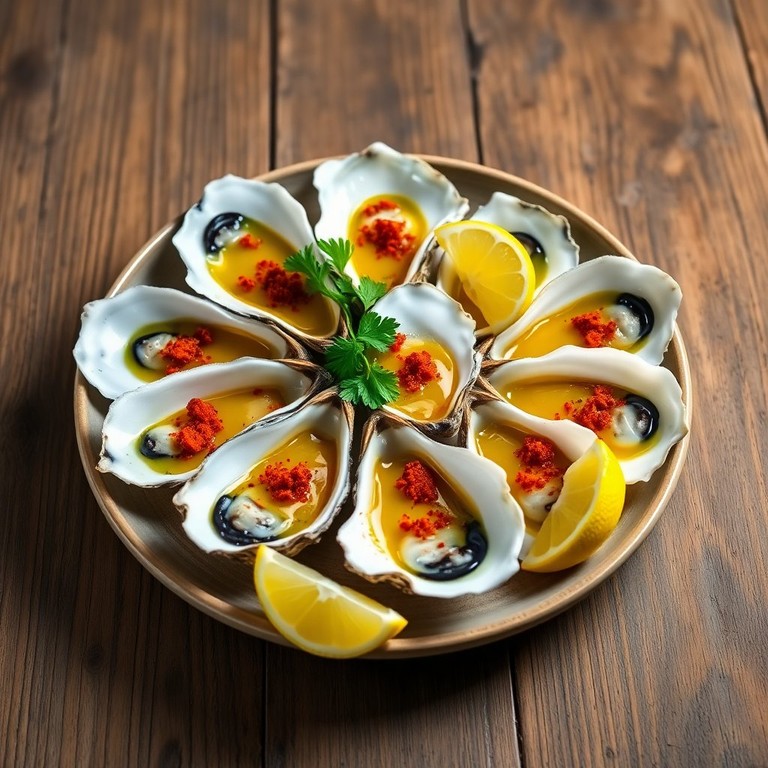 Disfruta de ostras frescas con un toque de aceite de oliva y pimentón ahumado, una deliciosa combinación que resalta el sabor del mar.