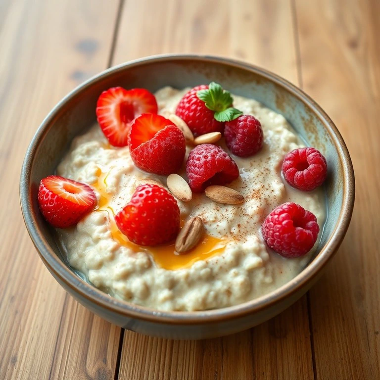 Un desayuno nutritivo que combina avena suave con fresas, frambuesas y almendras crujientes.