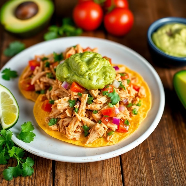 Disfruta de una combinación perfecta de pollo desmenuzado y guacamole cremoso sobre crujientes tostadas. Esta receta es ideal para una comida ligera y llena de sabor, perfecta para compartir con amigos y familia.