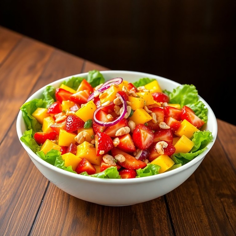 Uma salada refrescante e colorida que combina a doçura da manga e dos morangos com a crocância da alface e das castanhas de caju, perfeita para os dias quentes de verão.
