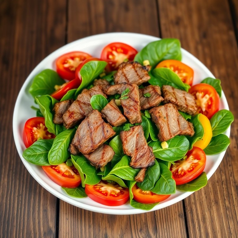 Ensalada Refrescante de Espinaca con Tomate y Carne a la Parrilla