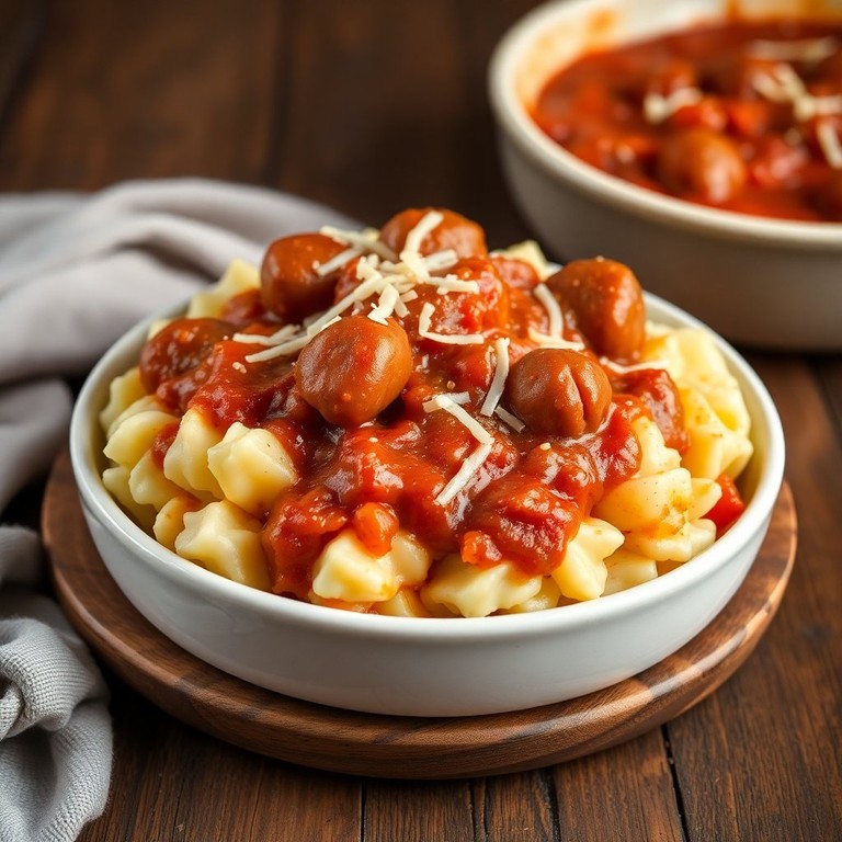 Cazuela de Puré de Patatas y Salchichas con Tomate
