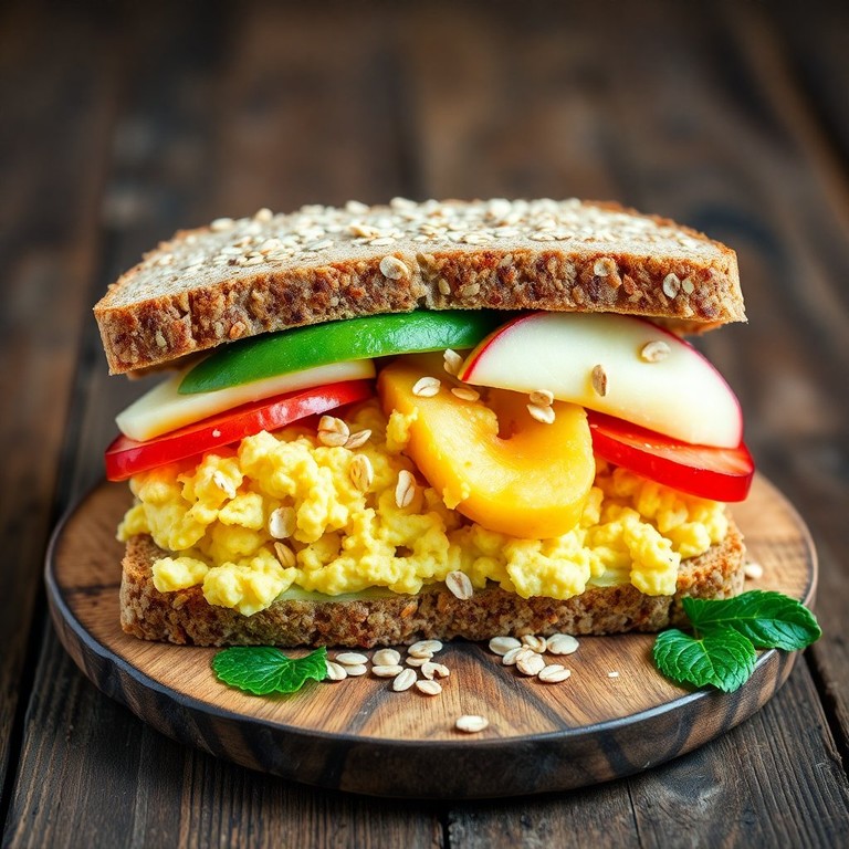Este sándwich combina la suavidad de los huevos revueltos y la textura de la avena con la frescura de las frutas, creando una opción nutritiva y deliciosa para cualquier momento del día.