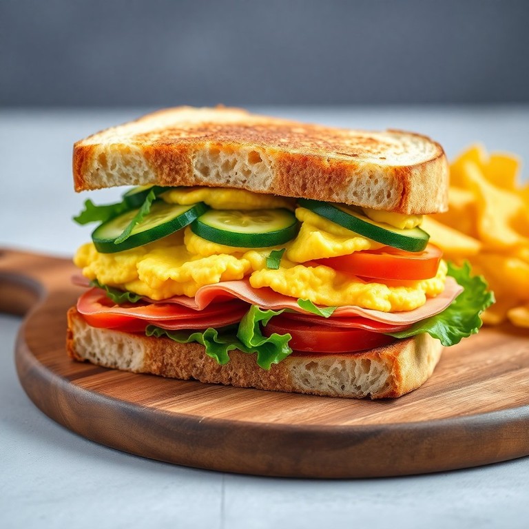 Un delicioso sándwich con huevo revuelto, jamón, y frescos vegetales entre dos rebanadas de pan.