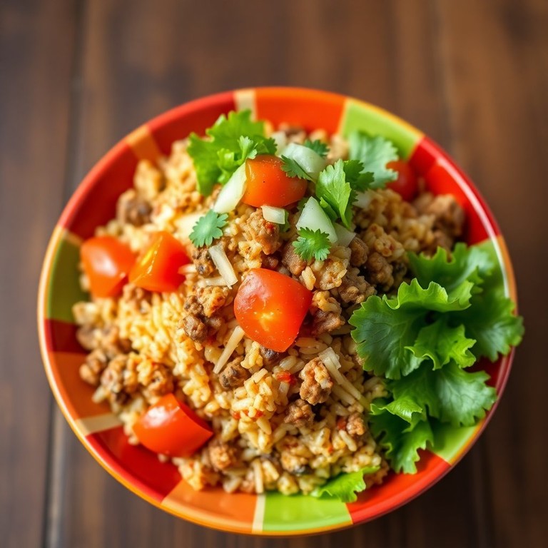 Un platillo vibrante y lleno de sabor, donde el arroz se mezcla con carne molida, tomates frescos y especias.