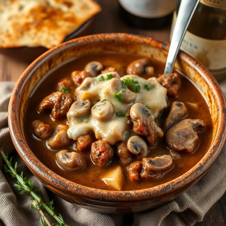 Un reconfortante guiso de carne y champiñones, cocido a fuego lento en una rica salsa de vino blanco y especias.
