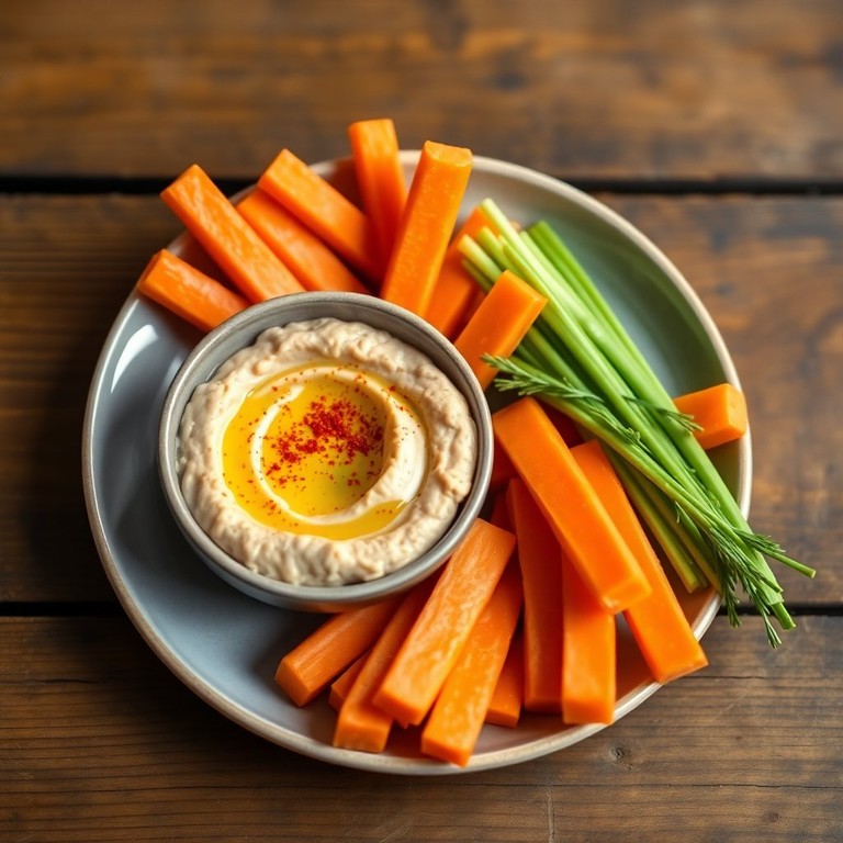 Crujientes palitos de zanahoria acompañados de un hummus cremoso y lleno de sabor, ideal para un snack saludable y nutritivo.