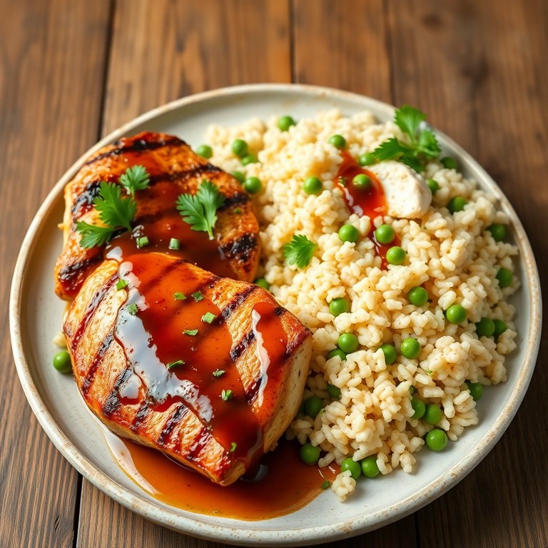 Jugosas pechugas de pollo a la plancha, bañadas en salsa inglesa y servidas con un suave arroz pilaf.