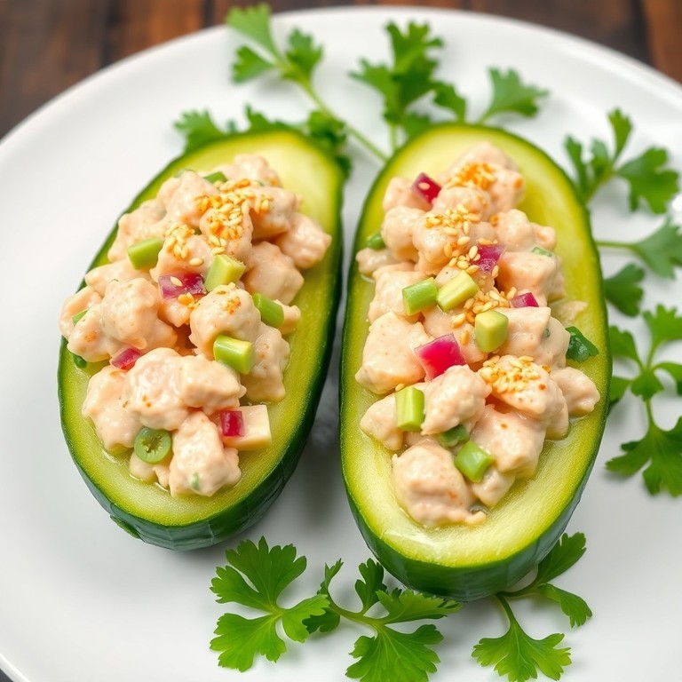 Una refrescante opción de pepino relleno con atún, aguacate y especias, perfecta para celiacos y diabéticos. Sin azúcares añadidos y libre de gluten.