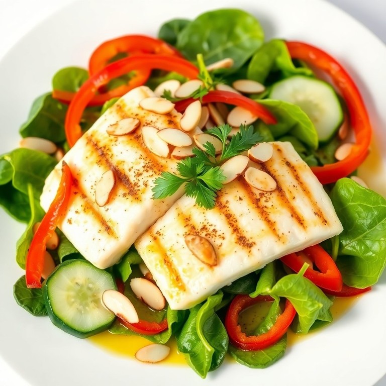 Una fresca ensalada de espinacas combinada con pescado a la parrilla, aderezada con limón y hierbas, ideal para una comida ligera y saludable, sin azúcar ni gluten.