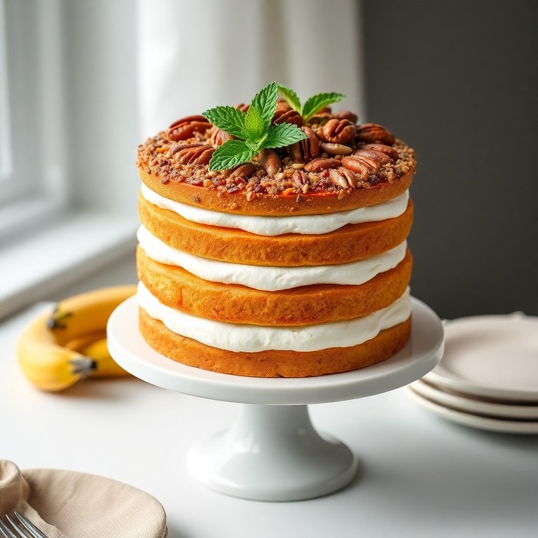 Explora el cake de guineo en capas: bizcocho aireado, mousse ligero, gelatina refrescante y crujiente de nueces pecanas.