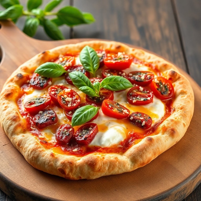 Una pizza sin gluten con una base crujiente de harina de coco, cubierta con ricotta cremosa sin lactosa, tomates secos rehidratados en aceite de oliva virgen extra y albahaca fresca. Ideal para celíacos y diabéticos, sin azúcares añadidos.